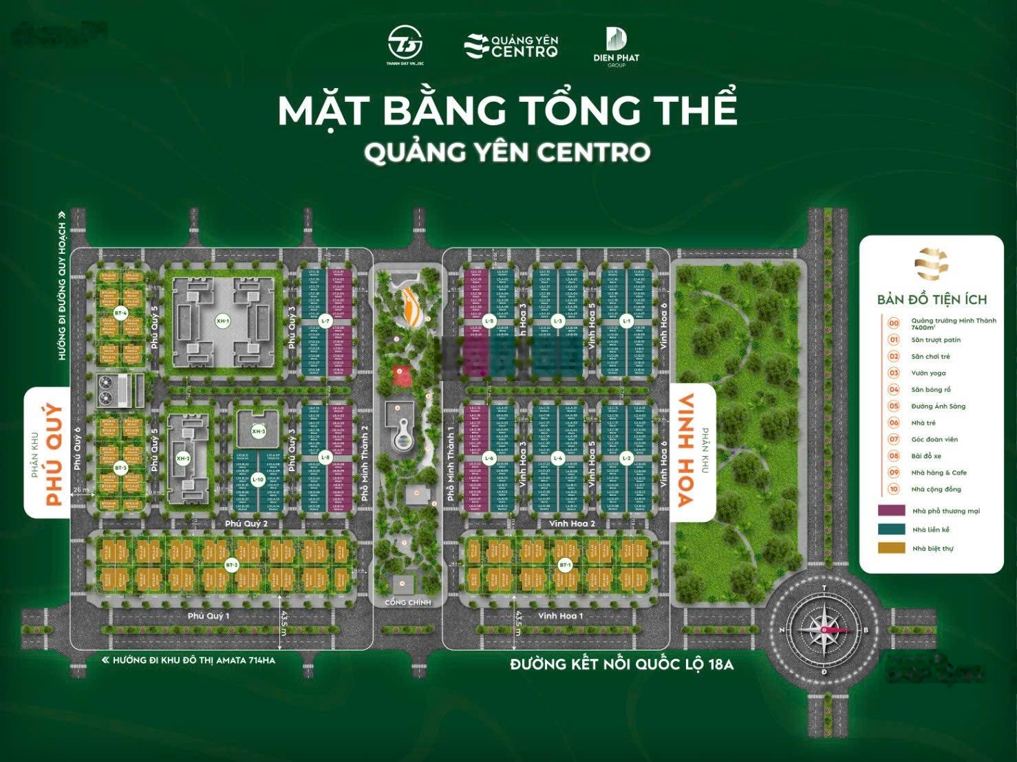 Quảng Yên Centro. Tâm điểm kết nối giao thương cảng biển - logistic - công nghiệp số 1 Miền Bắc. Vị trí khu Cát Thành, P. Đông Mai, tỉnh Quảng Ninh (Quảng Yên). Tâm điểm kết nối - hạ tầng đồng bộ. Nằm tại cửa ngõ kết vùng kinh tế Cảng biển - Logistic - Công nghiệm số 1 miền Bắc. Kết nối trực tiếp Hải Phòng và hành lang kinh tế quốc tế Quảng Ninh - Móng Cái. Thủ phủ của các siêu KCN lớn nhất khu vực. Các dự án từ 5p - 20p di chuyển. Kết nối thuận tiện KĐT Vinhomes Hạ Long Xanh, công viên Tuần Châu, nhà ga Đường sắt cao tốc Hà Nội - Hạ Long. Quy mô sản phẩm. Quy hoạch 11,2ha. Với 2 phân khu Vinh Hoa - Phú Quý. Liền kề: 246 lô, DT từ 85m2 - 96m2 (MT 5m). Biệt thự: 80 lô, DT 180m2 252m2 - 278m2 (mặt tiền 10m - 12m). Cao tầng: 3 tòa NOXH: ~ 500 căn hộ. Tiện ích đồng bộ, bài bản với Quảng trường Minh Thành rộng 7.400m2. Full tiện ích: Nhà trẻ, nhà cộng đồng, trung tâm dịch vụ, Sân Pickerball, vườn yoga...