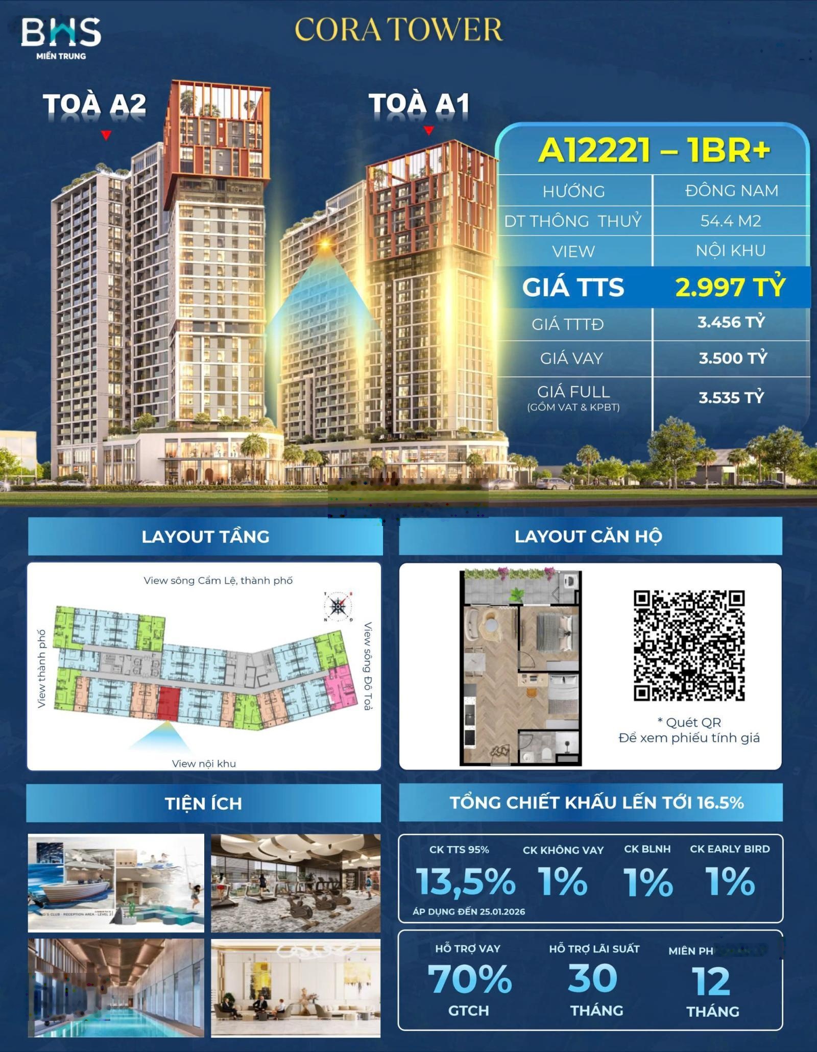 Siêu phầm 55tr/m2 (TTS) căn hộ 1BR+ A12221 Cora Tower(giá trung bình căn hộ ở Đà Nẵng 80tr/m2)