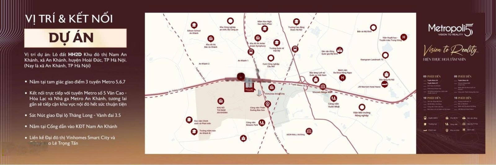 Căn hộ chung cư Metropoli5 tọa lạc tại xã An Khánh, Hoài Đức, Hà Nội, mang đến không gian sống lý tưởng với thiết kế hiện đại và tiện nghi đầy đủ. Vị trí chiến lược. - Tọa lạc tại tam giác giao điểm 3 tuyến Metro 5 6 7, đón đầu trục giao thông xương sống phía Tây Hà Nội. - Kết nối trực tiếp Metro số 5 Văn Cao Hòa Lạc, liền kề Nhà ga Metro An Khánh, rút ngắn thời gian di chuyển vào nội đô trong tương lai gần. - Nằm tại cổng dẫn KĐT Nam An Khánh, sát Đại lộ Thăng Long Vành đai 3.5, kết nối nhanh Mỹ Đình Cầu Giấy Tây Hồ Tây. - Liền kề Vinhomes Smart City và KĐT Geleximco Lê Trọng Tấn, hưởng trọn hệ sinh thái đô thị đã hình thành. Quy mô sản phẩm. - Quy mô 5 tòa tháp cao 3840 tầng, 3 tầng hầm liên thông với tổng diện tích ~60.000 m. - Giai đoạn mở bán: 2 tòa M1 & M2 với 537 căn hộ, mật độ thấp chỉ 89 căn/sàn. - Cơ cấu căn hộ: + 2 phòng ngủ: 77m2. + Thiết kế tối ưu công năng, không gian sống thoáng sáng, bố trí thông minh. + Tiêu chuẩn bàn giao cao cấp: Ban công kính, kính Low - E, điều hòa multi âm trần, bếp hoàn thiện từ các thương hiệu uy tín. Tiện ích nội khu. - 6 khối đế thương mại dịch vụ tại M1 & M2, đáp ứng trọn vẹn nhu cầu sống nghỉ mua sắm: + Nhà hàng, café, khu mua sắm. + Nhà trẻ, khu sinh hoạt cộng đồng. + Bể bơi ngoài trời, không gian cảnh quan thư giãn cho cư dân. Để biết thêm thông tin chi tiết và đặt lịch xem căn hộ, vui lòng liên hệ BDS Tân Long qua số điện thoại 0969048185