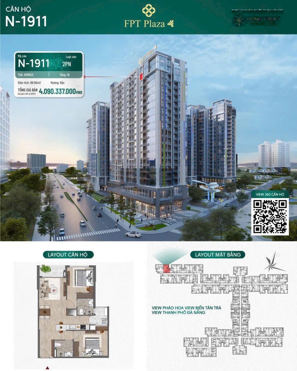 GIÁ 4 TỶ - Siêu Phẩm Full View tại tầng 19 FPT PLAZA 4 -------------------- TỔNG QUAN CĂN HỘ FPT PLAZA 4 ĐÀ NẴNG: - Vị trí: Hoàng Minh Thắng, KĐT FPT City, Ngũ Hành Sơn (đi thẳng ra biển chưa đến 2km) - Quy mô: 20 tầng nổi, 3 tầng hầm - Số lượng căn: 1.395 căn hộ -------------------- - Thời gian bàn giao : quý IV 2027 - Bàn giao nội thất cao cấp liền tường (xách vali vào ở ngay) - Hệ thống lọc nước toàn toà nhà - Ngân hàng hỗ trợ vay 75-85% - Hỗ trợ thanh toán tiến độ 24 tháng - Giá trực tiếp chủ đầu tư FPT - Miễn phí quảng ký 2 năm đầu -------------------- Hình thức thanh toán: - Tiến độ: Chia ra 07 đợt thanh toán - Vay: 75-85% -------------------- Liên hệ tư vấn: 0378123020Ngọc Lan HP) để được hỗ trợ thêm mọi thông tin và bảng giá