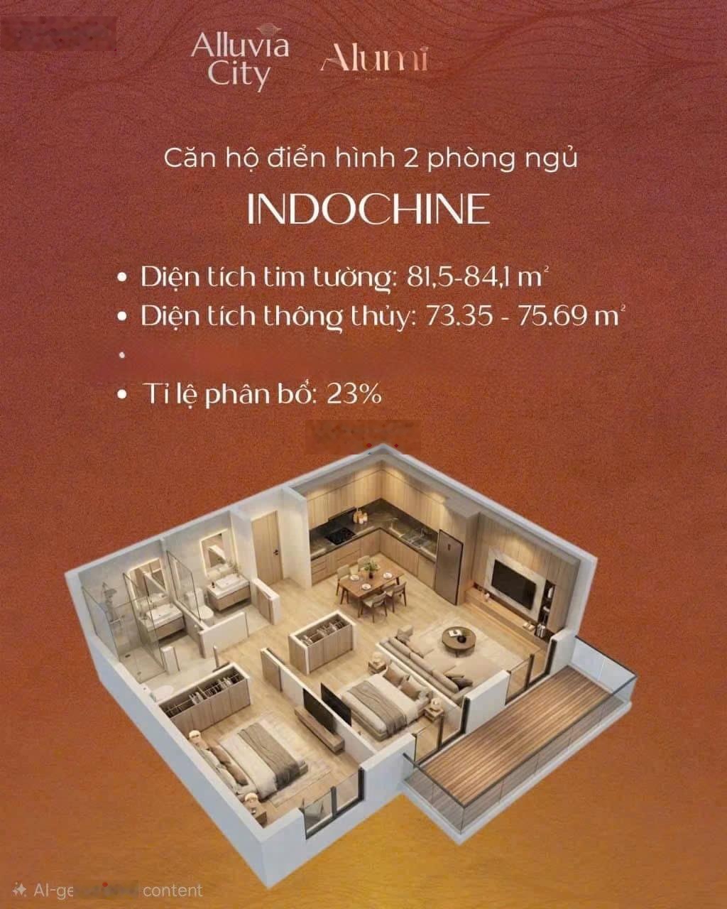 Căn hộ Allumi 3 Alluvia City tọa lạc tại Văn Giang, Hưng Yên, thuộc khu đô thị sinh thái quy mô lớn, định hướng không gian sống xanh yên tĩnh phù hợp ở thực và đầu tư dài hạn. Loại hình & diện tích căn hộ: 2PN: ~84m². Cơ sở hạ tầng kết nối: Vành đai 3.5. Cầu Ngọc Hồi. Sân vận động PVF. Đại học Bách Khoa cơ sở 2. Chính sách khách hàng booking sớm: Chiết khấu thanh toán sớm 10%. Vay vốn ngân hàng 65%, lãi suất 0% trong 24 tháng. Miễn phí dịch vụ 36 tháng + quà tặng. Không gian sống: Mật độ xây dựng chỉ 16%, tối ưu trải nghiệm sống xanh, riêng tư.
