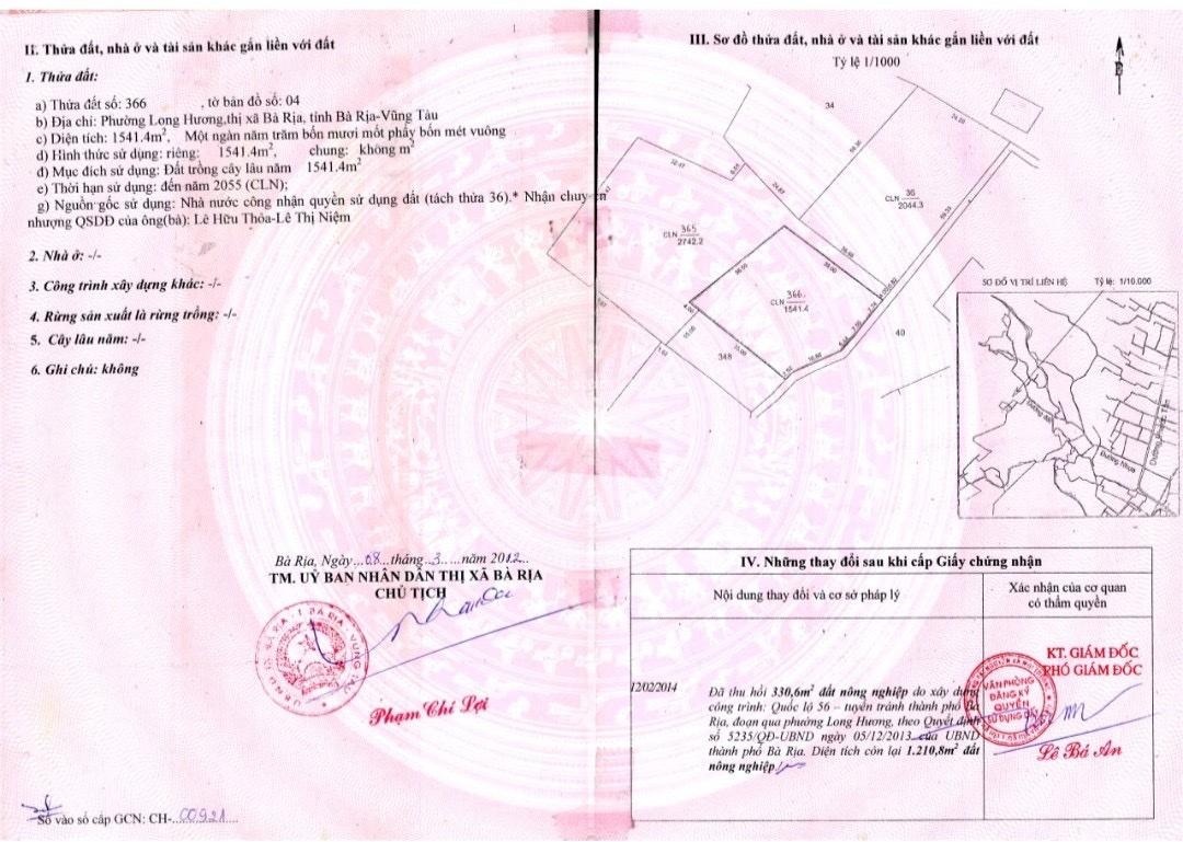 - Vị trí trục giao thông chính, phù hợp kinh doanh, kho bãi, showroom, sân thể thao, trạm dừng chân,... - Giá: 15,6tr/m² (giá còn thương lượng cho khách thiện chí). - DT trên sổ: 1541,4m2. - Diện tích tính giá: 1210.8 m2. - Hình thức: Đất 02 mặt tiền (mặt tiền trước ngang 38m² Quốc lộ 56; Mặt tiền sau nở hậu - Lộ giới đường xe hơi 4m). - Đang là đất cây lâu năm, có thể lên thổ cư. - Đây là con đường kết nối trung tâm các thành phố, thuận tiện đi vào thành phố Bà Rịa, về Vũng Tàu, Hồ Chí Minh, cao tốc về Biên Hòa. Tiện làm kho bãi, nhà xưởng, biệt thự nghỉ dưỡng,... View núi Dinh, hồ đá du lịch. - Liên hệ chính chủ: 0901667168 - ACE môi giới liên hệ phí cao.