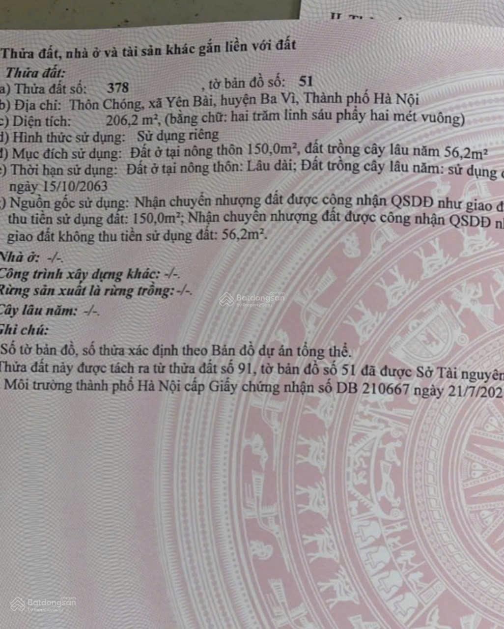 - Đất nghỉ dưỡng thôn Chóng, Yên Bài, Hà Nội - Tổng diện tích 270m2, diện tích trong sổ 206m2, (150m2 thổ cư), mặt tiền 10,5m, đất nở hậu - Đất bám mặt đường bê tông thông thoáng, ô tô tránh nhau thoải mái - Thế đất bằng phẳng, view thoáng, lưng tựa núi, khí hậu mát mẻ - Vị trí cách nhà văn hóa, chợ, trường học, ủy ban chỉ vài trăm mét - Cách trung tâm Hà Nội khoảng 40 phút lái xe - Xung quanh đất có nhiều homestay của người Hà Nội, nhiều villa, resort nổi tiếng - Pháp lý ranh giới rõ ràng, sẵn sổ hồng riêng - Giá 2,5 tỷ Liên hệ (zalo): 0975349726