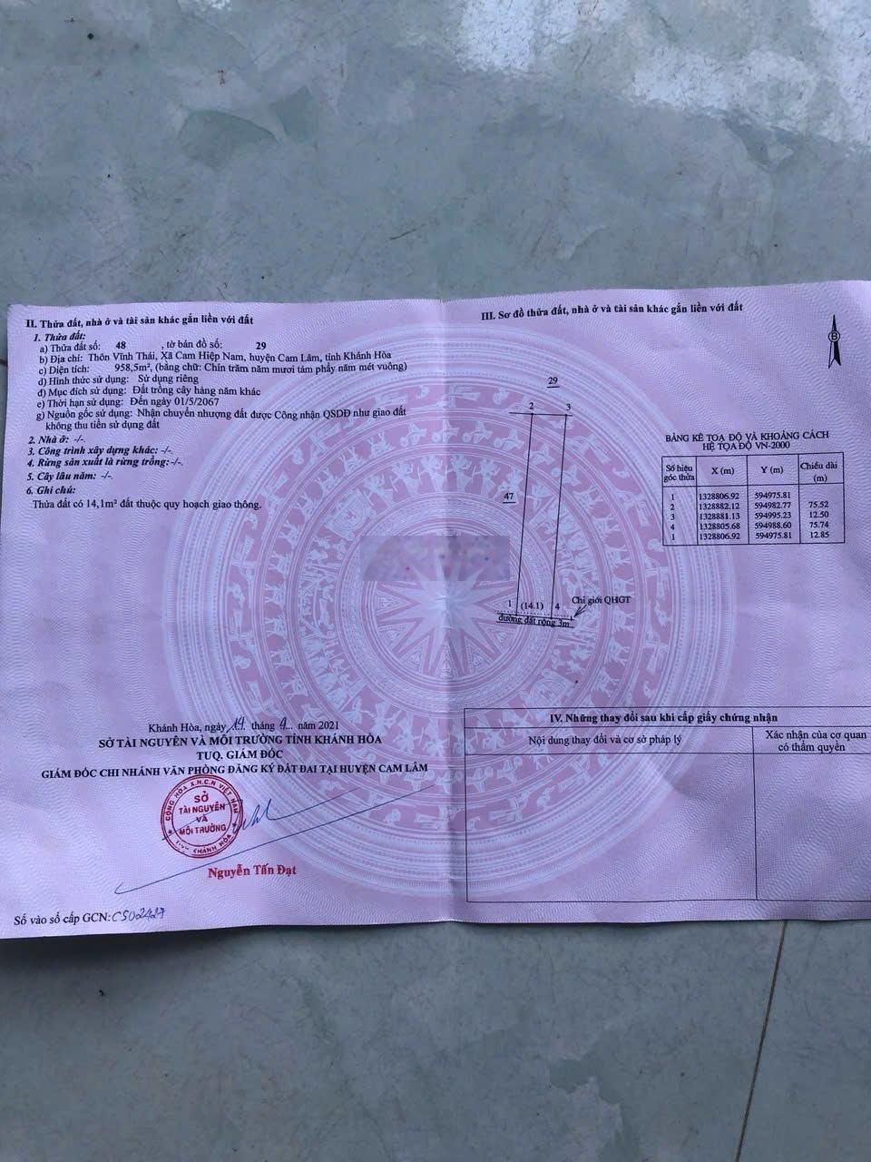 Bán lô đất rộng tại Cam Hiệp Nam, Khánh Hòa diện tích lớn, giá cực mềm. Diện tích: 958,5m² rộng rãi, dễ phân lô hoặc xây dựng. Vị trí: Thuận tiện di chuyển, gần khu dân cư và các tiện ích. Lợi thế: Giá siêu mềm, phù hợp đầu tư lâu dài hoặc tích lũy tài sản. Giá bán: 450 triệu cả lô cơ hội hiếm, giá cực tốt cho quỹ đất gần 1.000m². Liên hệ ngay Em Ly 0367857917 để xem đất thực tế.