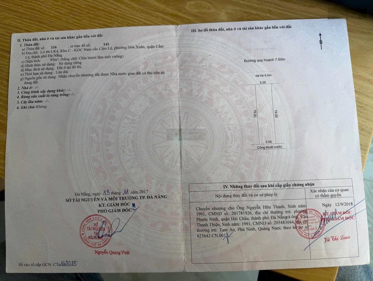 Cần bán :đất 7m5 Cẩm Nam 12 lên nhà 45 thuộc Hoà Xuân, Đà Nẵng - hướng Bắc -Dt: 95m2 lô sạch đẹp. Giá bán 5,4 tỷ Tl Nắm chủ 0905077620