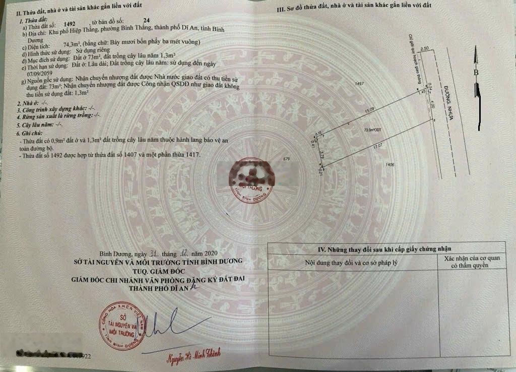 Diện tích: 74,3 m². Trong đó: Đất ở: 73 m²; Đất trồng cây lâu năm: 1,3 m² Hình thức sử dụng: Sử dụng riêng Pháp lý: Sổ hồng riêng, không tranh chấp, sang tên nhanh Gần Metro Suối Tiên, Làng Đại học, bến xe Miền Đông mới