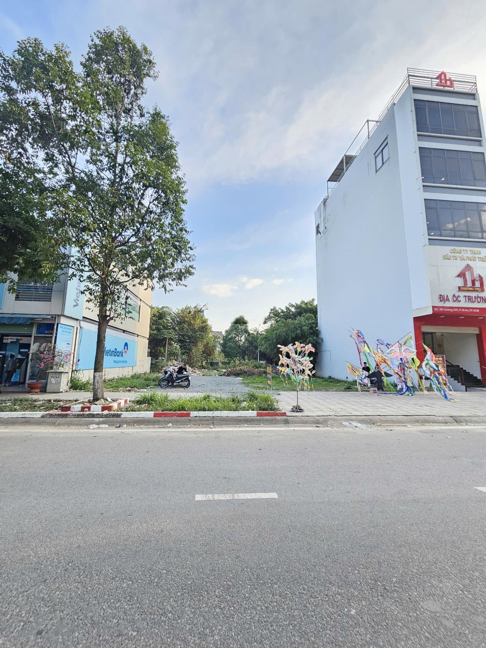 Bán đất MT đường GS1 p. Dĩ An Tp. Dĩ An. DT: 93,8m2, thổ cư: 100% (5x18,7m). Cách đường Nguyễn An Ninh 50m. Phù hợp kinh doanh đa nghề. Đường rộng 32m thông hai đầu. Sổ hồng riêng. Ngân hàng hỗ trợ 70%. Giá: 15tỷ TL. LH: 0946523939