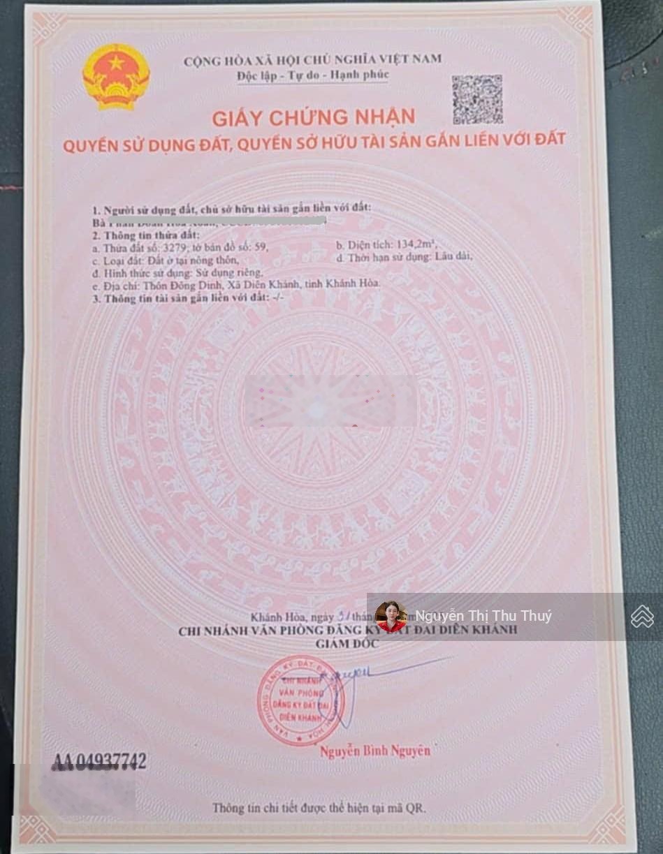 Bán lô đất đẹp tại Diên Toàn - Diên Khánh, Khánh Hòa. - Diện tích: 134m², đất vuông vắn. - Giá bán: 16 triệu/m² (giá tốt khu vực). - Đường ô tô tới đất, hạ tầng hoàn chỉnh. - Khu dân cư đông đúc, an ninh tốt. - Phù hợp xây nhà ở, đầu tư lâu dài. Liên hệ: 0962210933