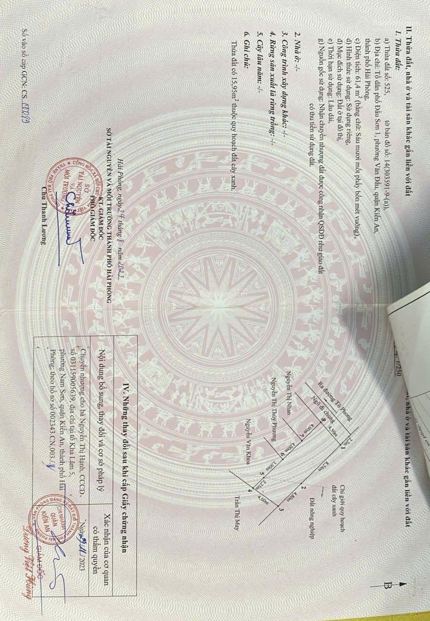 Bán lô đất tại Tô Phong-Kiến An-Hải Phòng Diện tích:61m2 Cách mặt đường Tô Phong hơn trăm mét, ngõ vào gần 4m. Cạnh nhà văn hoá Cách đường Nguyễn Lương Bằng vài trăm mét Giá:1 tỷ1 LH:0932140791