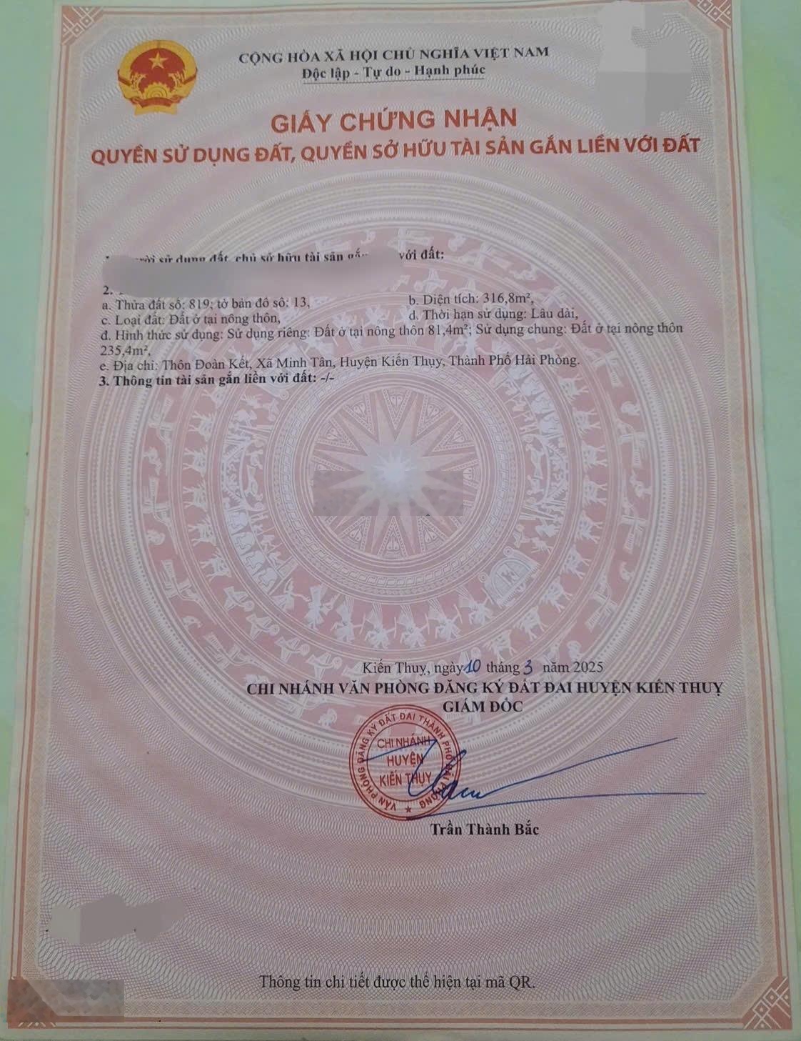 Lô đất tại Minh Tân - Kiến Thụy đèn cao áp sáng như chung cư. - Diện tích: 81.4m2. Đường 4m đến 7m ô tô đánh võng tránh nhau. - Khu vực đông dân. Toàn nhà đẹp. Bán kính 600m chợ ubnd trường học. Ra TT huyện 1km. Sang Quận Dương Kinh. Đi Aeon. TTTP 15p di chuyển. - Đất sạch ko lỗi lầm, Bìa hồng, hướng Nam mát mẻ. Giá 1 tỷ2 - LH Thu Huyền 0936623139