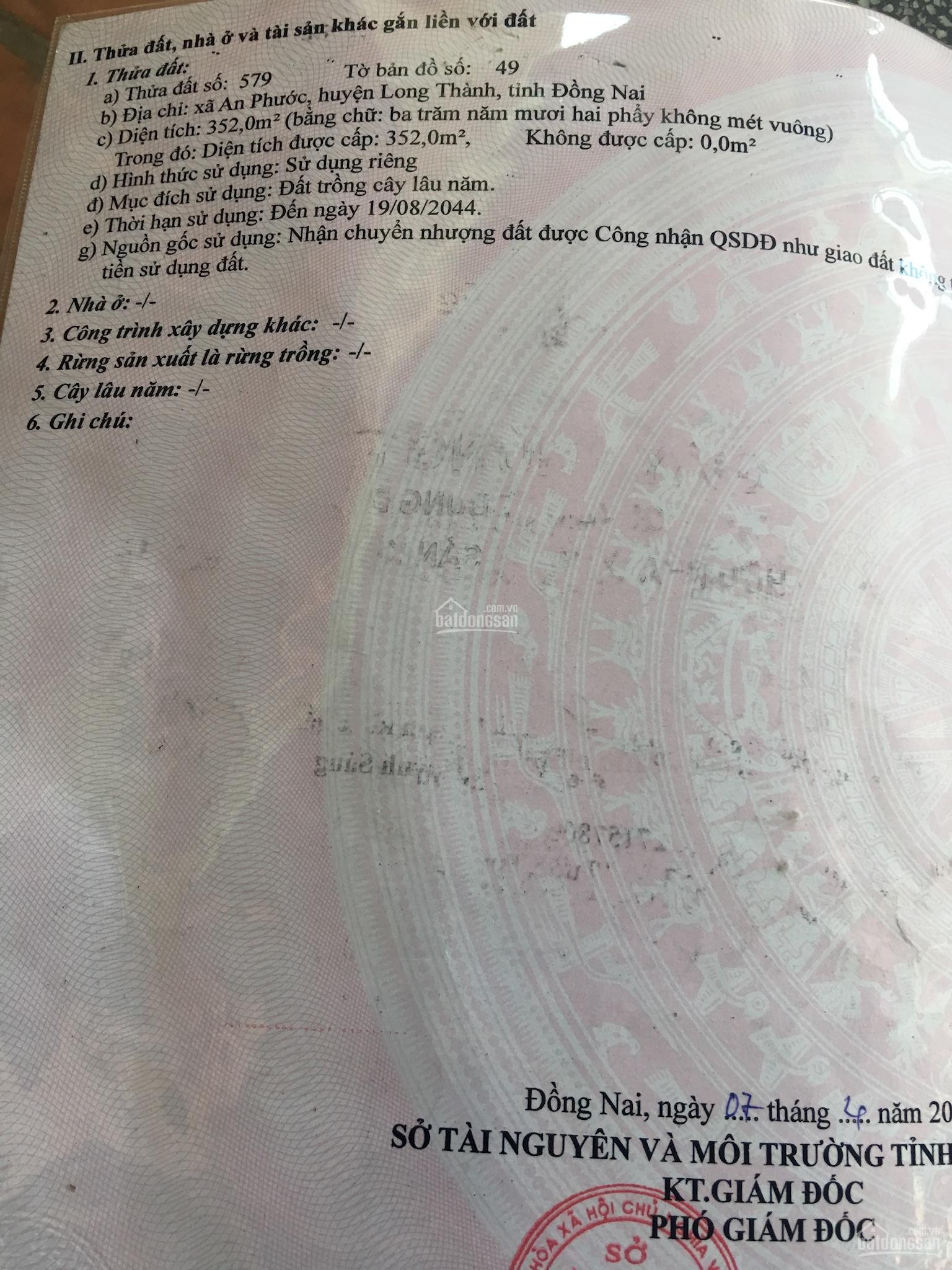 Giá: 3ty tl..diện tích: 360m2. Thông tin mô tả. Ngay khu Thung Lũng Xanh. Cổng khu công nghiệp long thành. Vì mở rộng kinh doanh nên tôi cần bán nhanh lô đất 350m2. Thổ cư 100m2. Có thể lên thêm 230m nữa. Tách được 3 sổ riêng. Tại Ấp 5, An Phước, Long Thành, Đồng Nai. KDC hiện hữu, an ninh tốt. Tiện Ích đầy đủ bán kính 500m: Siêu thị, ngân hàng, khu vui chơi giải trí, trường học cấp 1,2,3. DT: 15x24m. Đường bê tông 6m, xe hơi vào tận đất, thích hợp phân lô xây nhà vườn. Giá: 3tỷ TL.