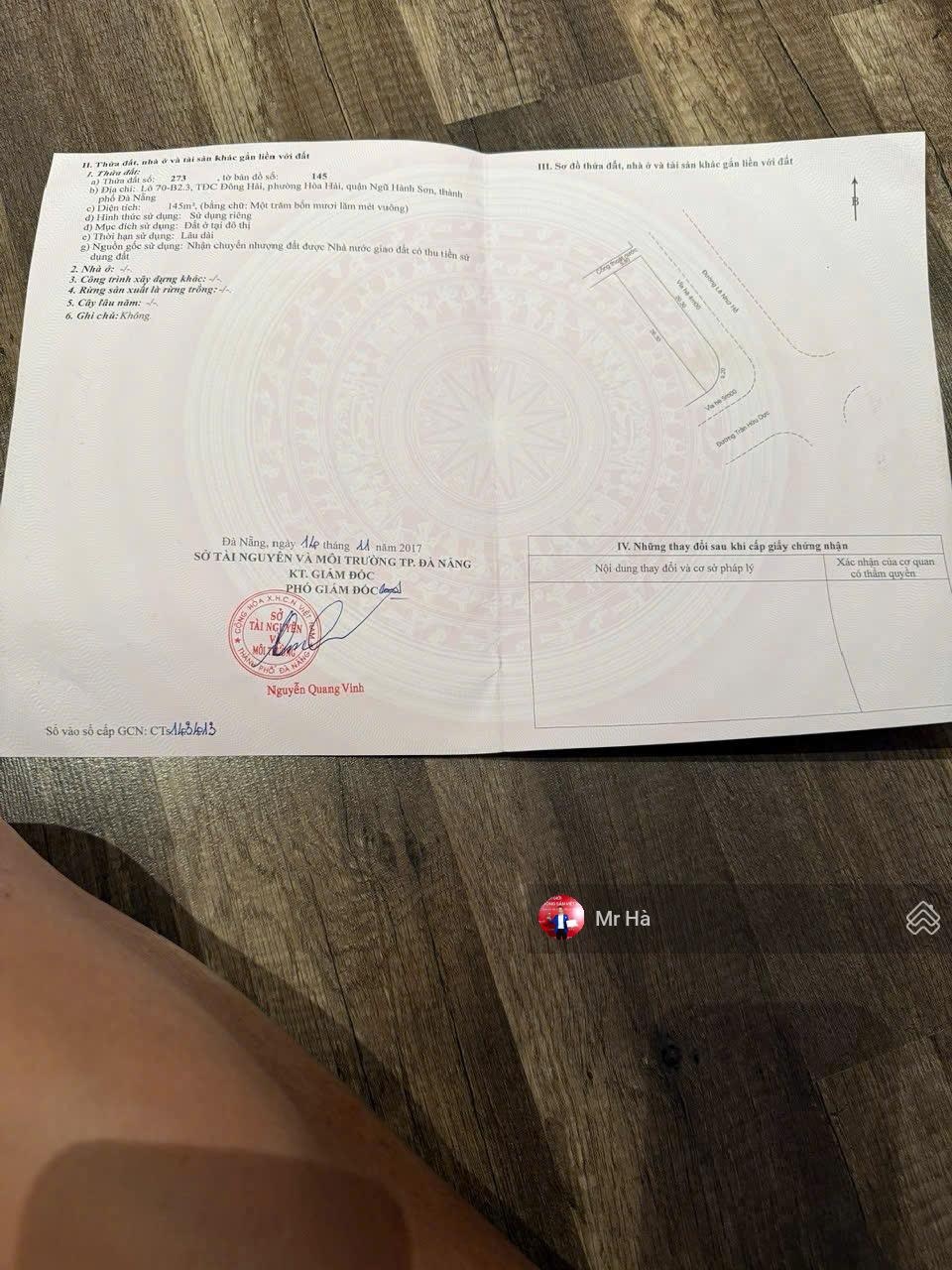 Chào bán lô góc đường Trần Hữu Dực và Lê Như Hổ, Ngũ Hành Sơn, Đà Nẵng. - DT: 6,5x 26m = 145m2. - Hướng Đông Bắc. - Đường 30m và 15,5m. - Vỉa hè 9m và 5m. * Vị trí đối diện dãy resort, sát biển, tuyến đường du lịch Đà Nẵng - Hội An, dân trí cao an ninh cực tốt. * Thích hợp xây nhà nghỉ, khách sạn. - Giá bán: 14,5 tỉ. - Liên hệ: 0935965066 Mr. Hà Hùng Long xem đất.