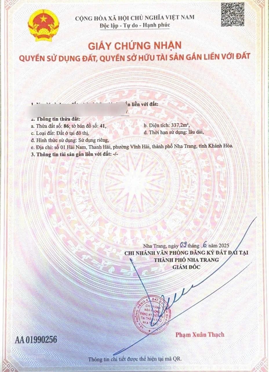 Cần bán: 72,6 tr/m2. BÁN ĐẤT XÂY CĂN HỘ, KHÁCH SẠN, HẺM CỦ CHI (ĐƯỜNG HẢI NAM) VĨNH HẢI, NHA TRANG. .. Thông tin chi tiết: Diện tích: 337,8m² (ngang 9m), hình thửa đẹp. Lợi thế nổi bật: 2 mặt đường thoáng. Đường trước nhà rộng 6m. Hẻm bên hông 2m. Vị trí: Cách đường Củ Chi chỉ 30m. Cách biển Phạm Văn Đồng khoảng 300m. Khu dân cư hiện hữu, kinh doanh sầm uất, nhu cầu lưu trú cao. Hiện trạng: Có nhà hiện hữu, đang cho thuê 15 triệu/tháng Pháp lý rõ ràng, thuận tiện khai thác ngay hoặc xây dựng mới .. Giá bán: 24,5 tỷ. (~ 72,6tr/m2). Hỗ trợ thương lượng trực tiếp cho khách thiện chí, quyết nhanh. Liên hệ xem đất thực tế: 0986192628 / 0986192628 gặp Tiến Dũng