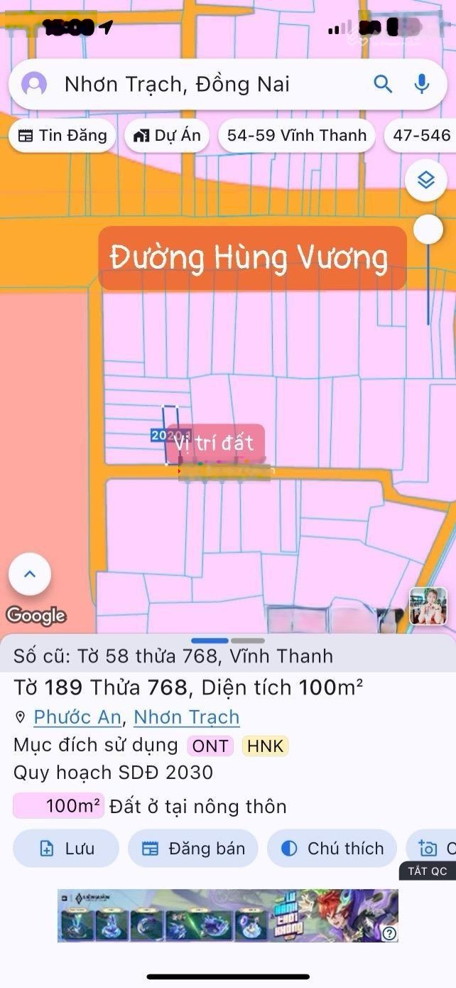 Chính chủ bán lô đất thổ cư, diện tích 100m2, chỉ. Cách đường Hùng Vương tầm 50m. Đất thuộc xã Vĩnh Thanh, Nhơn Trạch, Đồng Nai. + Ngang 5m dài 20 = tổng 100m2. + Đã có 98m2 thổ cư. + Đường bê tông láng mịn, sạch đẹp, xung quanh dân ở đông đúc. + Vị trí lô đất bên cạnh nhà thờ giáo xứ Thiết Nham. + Giá bán: 1,87 tỷ. + Sổ hồng đầy đủ, mua bán công chứng ngay. Lh: 0909254599 Kim Liên.