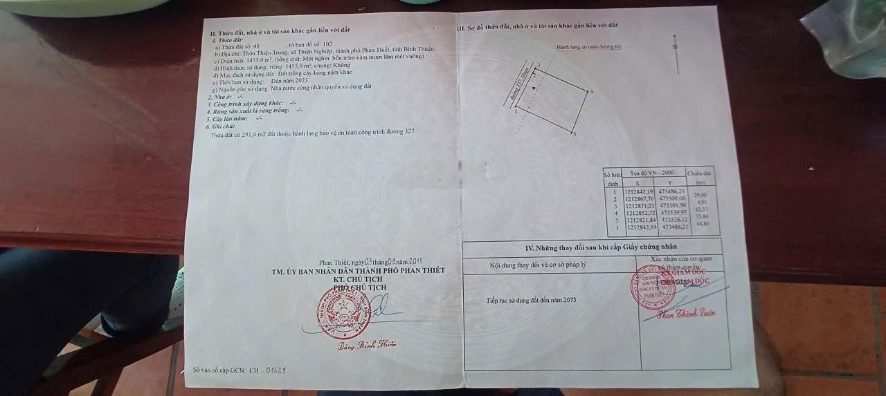 Mặt tiền đường Hồ Quang Cảnh, Thiện Nghiệp, TP Phan Thiết - Tỉnh Lâm Đồng - Diện tích: 1455m2 cây lâu năm - Mặt tiền: 33m x 43m - Khu dân cư đông đúc, gần chợ, trường học vvv - Cách đường Võ Nguyên Giáp 700m, xuống tới biển & thủ phủ resort chỉ 2,5km - Kết nối sân bay chỉ 10phút, gần siêu dự án Sun Group - Quy hoạch thổ cư 100% - Sổ hồng chính chủ - Giá 6,7tỷ làm việc trực tiếp - Hotline & zalo: 0921051051 Minh để được hỗ trợ tư vấn & đưa đi xem đất miễn phí - Nhận kí gửi & tư vấn mua bán nhà đất, Phan Thiết - Tỉnh Lâm Đồng