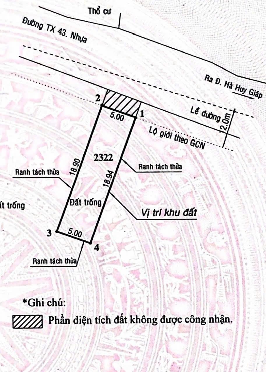 BÁN ĐẤT MẶT TIỀN THANH XUÂN 43 Q12 94,6m² (ngang 5m, dài gần 19m) Full thổ cư, sổ riêng Cạnh trường học ở hay đầu tư đều ok Giá rẻ 5ty5 còn thương lượng Inbox em Thảo gặp chủ chốt ngay