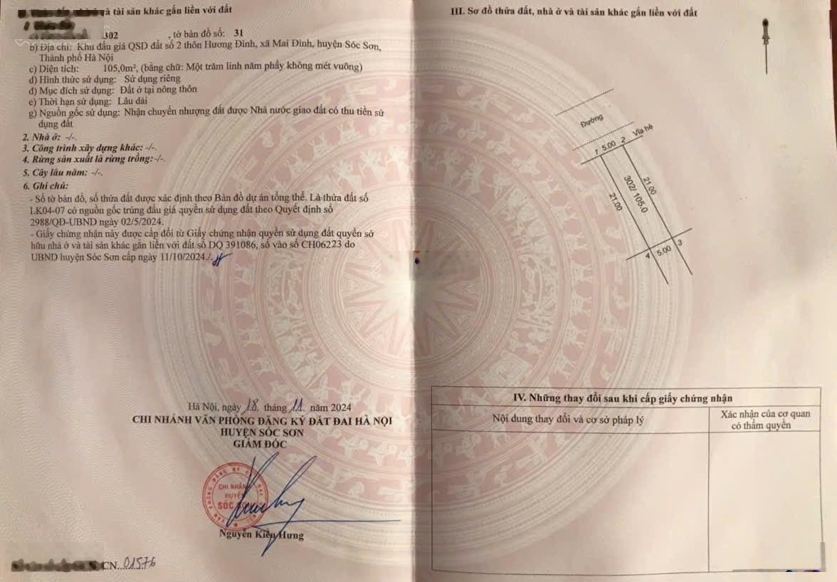 Chính chủ cần bán LK4-7 Khu Đất Đấu Giá Hương Đình- Mai Đình- Sóc Sơn- HN: - Diện tích: 105m2 , mặt tiền 5m Hạ tầng khu đấu giá cực kì đẹp: vỉa hè rộng , lát đá, đường trải nhựa, tủ điện hạ ngầm, cây xanh nội khu cực kỳ mát mẻ - Vị trí đắc địa nằm kẹp giữa 3 Khu CN Lớn nhất Sóc Sơn: CN2, CN3, KHU CN Nội Bài. - Nằm cạnh lõi khu đô thị vệ tinh, và các tuyến đường huyết mạch. Dân cư đông đúc với nhiều tiện ích , kết nối giao thông thuận lợi Liên hệ em Hưng để được tư vấn: 0974481235