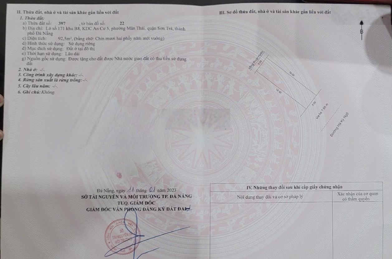 Bán đất mặt tiền đường Hà Kỳ Ngộ, Sơn Trà, Đà Nẵng. - Diện tích 185m2, mặt tiền 10m, hướng Đông. - Đường rộng 15m, vỉa hè 7.5m nối dài Hồ Nghinh, ngay gần toà tháp đôi Vương Thừa Vũ. - Cách biển chỉ 200m, ngay gần công viên cá voi, khách sạn Hilton,... - Dòng tiền cho thuê 60 tr/tháng. - Giá bán: 38 tỷ, thương lượng nhẹ. - Liên hệ: 0949733415 - Phạm Triều, để xem đất và làm việc chính chủ.
