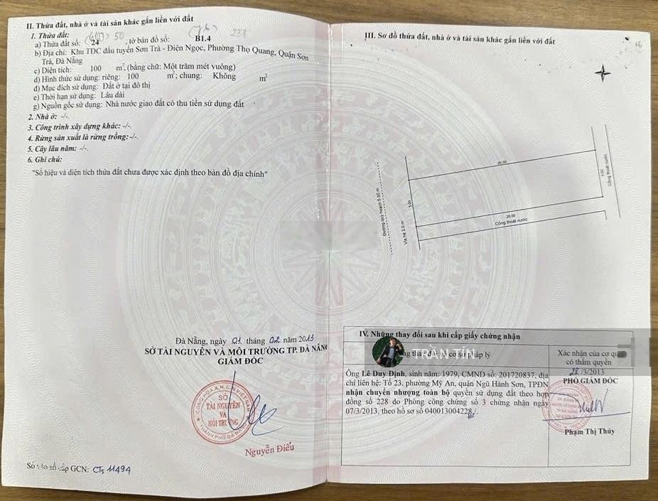 Lô đất mặt tiền đường Thành Vinh 3, Cách biển 200M Diện tích : 5m x 20m = 100m2 Hướng Tây Nam, đường 5m5 vỉa hè 3m Khu đầu tuyến Sơn Trà, không khí trong lành, Yên tĩnh, Lưng tựa Núi mặt hướng Biển Phong thuỷ tốt. Phù hợp Xây nhà ở định cư, Toà Căn Hộ Apartment GIÁ BÁN : 8 tỷ 600 Liên hệ : 0568436789