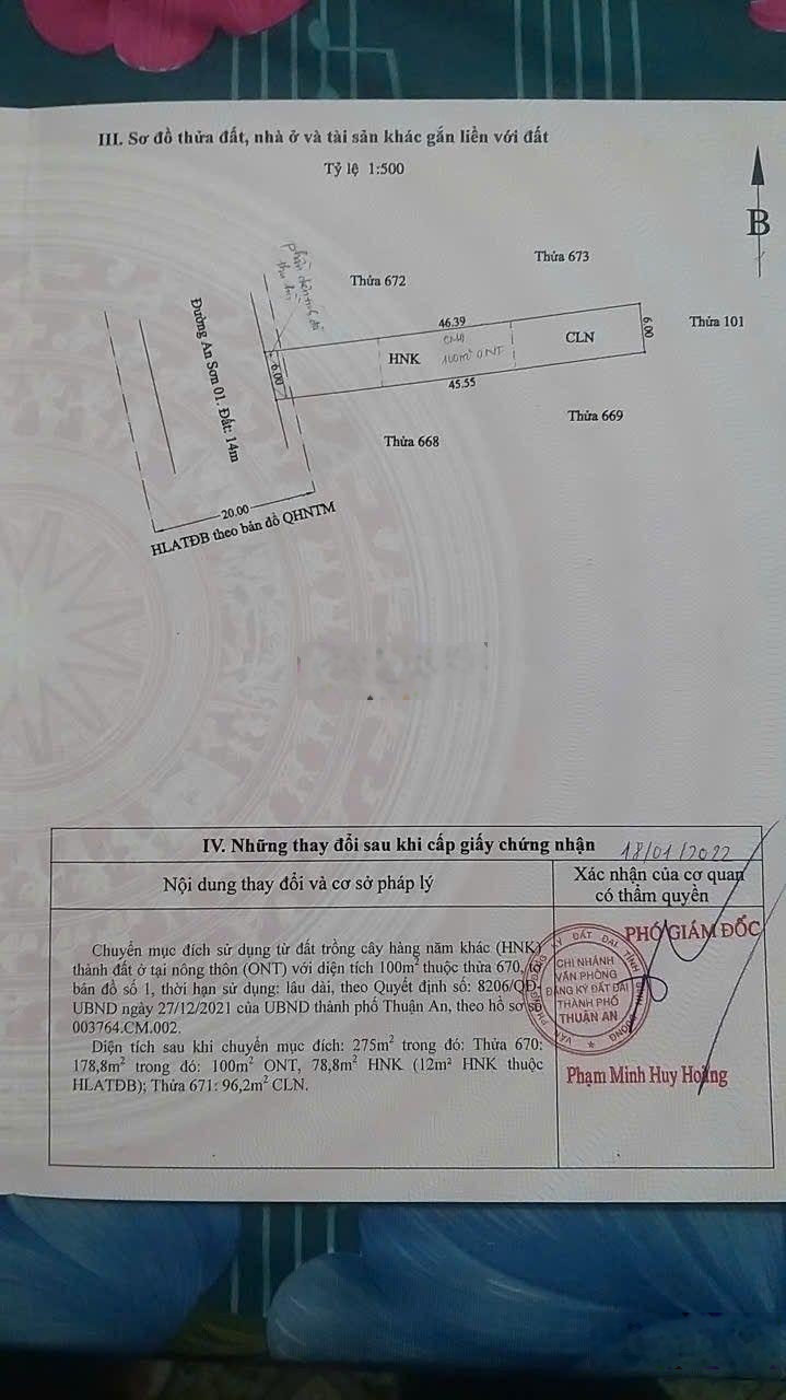 Bán lô đất mặt tiền đường An Sơn 01 Thuận An Bình Dương Diện tích 6 x 47 =275 thổ cư 100 m gần cầu Bình Quới gần đường vành đai 3 giá 3ty695 Liên hệ 0961410279
