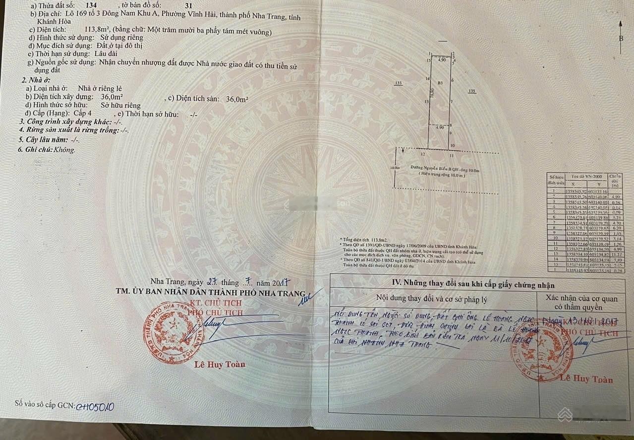 Bán đất có nhà 2 tầng cũ, mặt đường Phạm Ngọc Thạch. Vĩnh Hải, P. Bắc Nha Trang, Tp Nha Trang. Giá tốt: 13,5 tỷ - DT: 113,8m2. Diện tích: 113,8m2. Ngang 4,9m. Hướng chính Nam mát mẻ. Sổ hồng thổ cư. Xây dựng tự do. Trên đất có nhà 2 tầng cũ. Có thể sửa chữa. Sơn sửa lại để ở hoặc cho thuê. + Vị trí: Cách bãi biển 250m. Khu vực tập trung nhiều khách sạn, nhà hàng... - Đường nhựa 10m, cao ráo, có lề đường. - Phù hợp xây khách sạn, căn hộ cao cấp. Giá bán: 13,5 tỷ. Bớt nhẹ. Liên hệ: Mr Long 0948918580, 0948918580