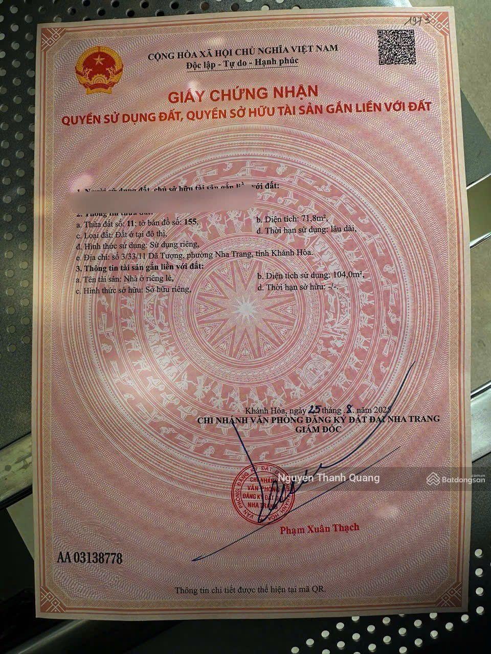 NHÀ GẦN BIỂN ĐƯỜNG D4 ,THÔNG LÊ THANH NGHỊ & NGUYỄN LỘ TRẠCH, PHƯỜNG NHA TRANG8.3tỷ Diện tích: 71,8m - Chiều ngang: 5m Diện tích sử dụng: 104m Hướng ban công: Tây Bắc Kết cấu: Nhà 2 tầng 2 phòng ngủ rộng + 2 nhà vệ sinh có chỗ đậu ô tô trước nhà Vị trí: Thuộc khu dân cư ổn định, an ninh tốt cách biển và trung tâm vài phút di chuyển Gần chợ, trường học, khu vực dân cư sầm uất Giá bán: 8.3tỷ ( tl ) Pháp lý: Sổ hồng riêng đã hoàn công Thuế phí bên nào bên đó chịu. Lh: Thành Quang 0915620867 72