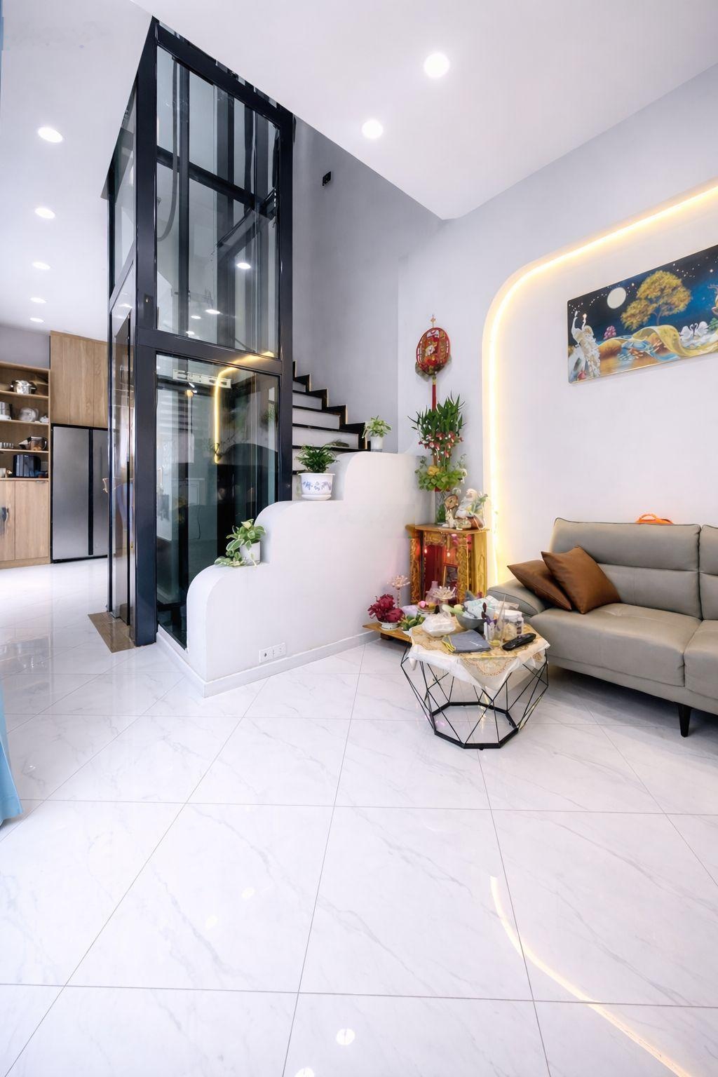 Nhà mới thiết kế đẹp, ở là sướng Kết cấu BTCT kiên cố, hoàn công chuẩn Gồm: Trệt + 2 lầu + sân thượng, ban công thoáng mát các tầng 4 Phòng ngủ 6wc Có phòng thờ riêng, phòng giặt, bếp phụ trên sân thượng Sân thượng ngang tới 10m hiếm, rộng, cực chill Có THANG MÁY trong nhà lướt chuyển nhẹ nhàng, người lớn tuổi ở rất hợp Chủ tự thiết kế từ ngoài vào trong, bố cục hợp đất hợp phong thuỷ Vị trí hiếm nhà so sánh Hẻm 5m 2 xe hơi né nhau thoải mái Lô góc 2 mặt hẻm, cực kỳ thoáng Cách mặt tiền Huỳnh Tấn Phát chỉ ~100m Cách Cầu Tân Thuận ~300m, qua Quận 4 Quận 1 chỉ 5 phút xe máy Diện tích đất: 35m Diện tích sàn hoàn công: 127m Sổ hồng riêng, KDC hiện hữu Hoàn công đủ, không quy hoạch không lộ giới Hỗ trợ khách mua + vay ngân hàng, công chứng nhanh gọn