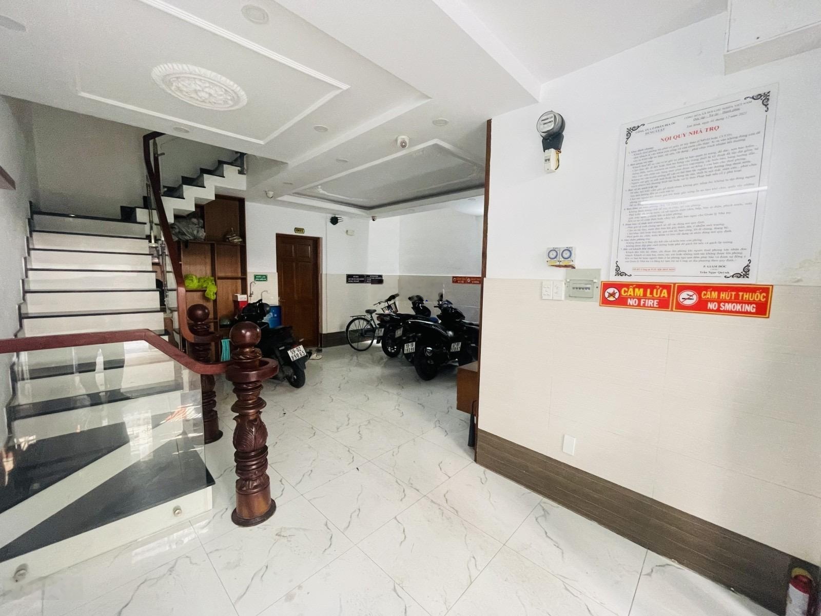 Trệt, lửng, 2 lầu, sân thượng, mái che cầu thang. Nhà trọ xây mới, đẹp, đầy đủ tiện nghi, Wifi, Camera, sân để xe, cổng rào Đang cho thuê FULL 7 phòng thu nhập ổn định 30 triệu/tháng. Nội thất cao cấp: ốp gỗ, ốp đá hoa cương, khóa vân tay Hướng nhà: Tây Bắc. HXH cách mặt tiền Nguyễn Phúc Chu 100m, gần chợ, trường học Tân Trụ. Mong tiếp khách mua thiện chí, không tiếp môi giới hay trung gian