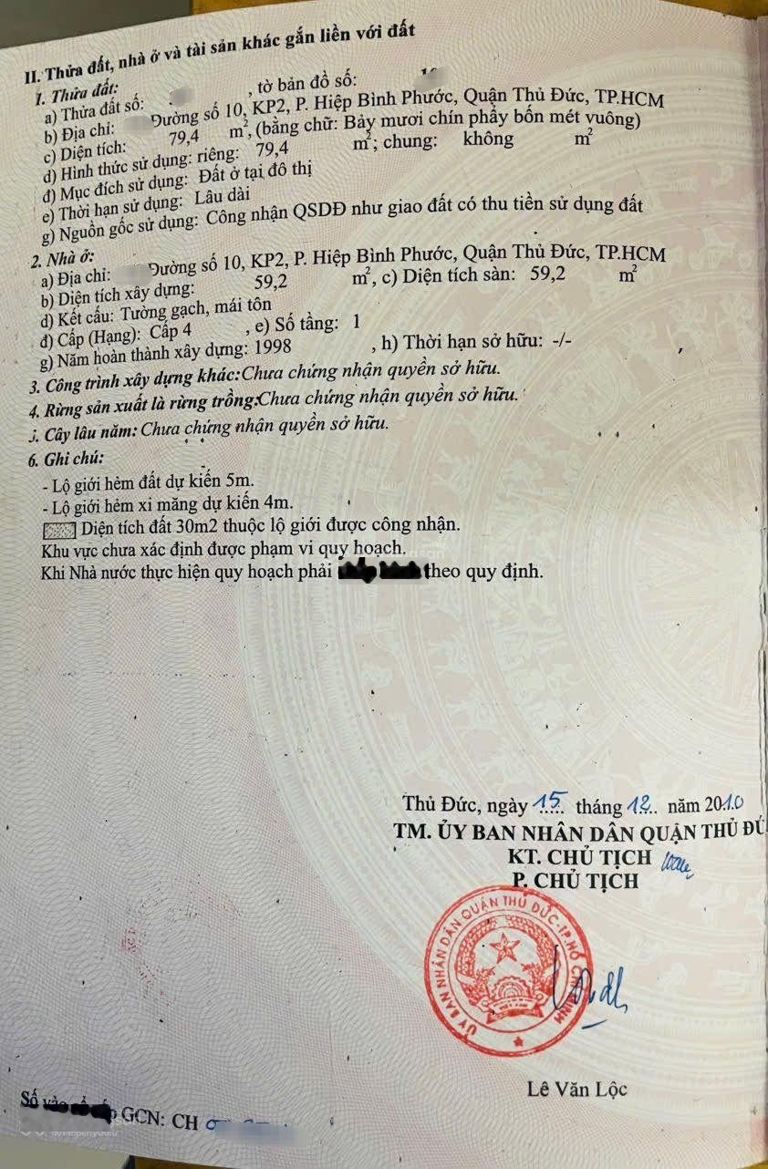 Lô góc đường Số 10, Hiệp Bình Phước (30m ra QL13) - 80m2 (6.2x12.3) full thổ cư - giá 4 tỷ TL. - Diện tích: 80m2. - Kết cấu: Nhà cấp 4, hiện đang chia thành 2 căn cho thuê, dòng tiền ổn định 6 triệu/tháng. - Công năng: 2 phòng ngủ, 2 nhà vệ sinh, thích hợp để ở hoặc đầu tư giữ tiền. Lh: 0909461226